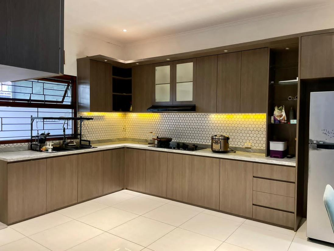 • Dapur: Include Kitchen Set full berbentuk L + kompor tanam electrolux 3 tungku + cooker hood Teka.